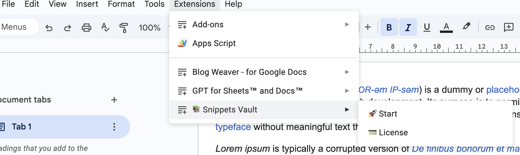 Once you have installed 📚 Snippets Vault from the Google Workspace Marketplace Click on Extensions> 📚 Snippets Vault and select the menu.